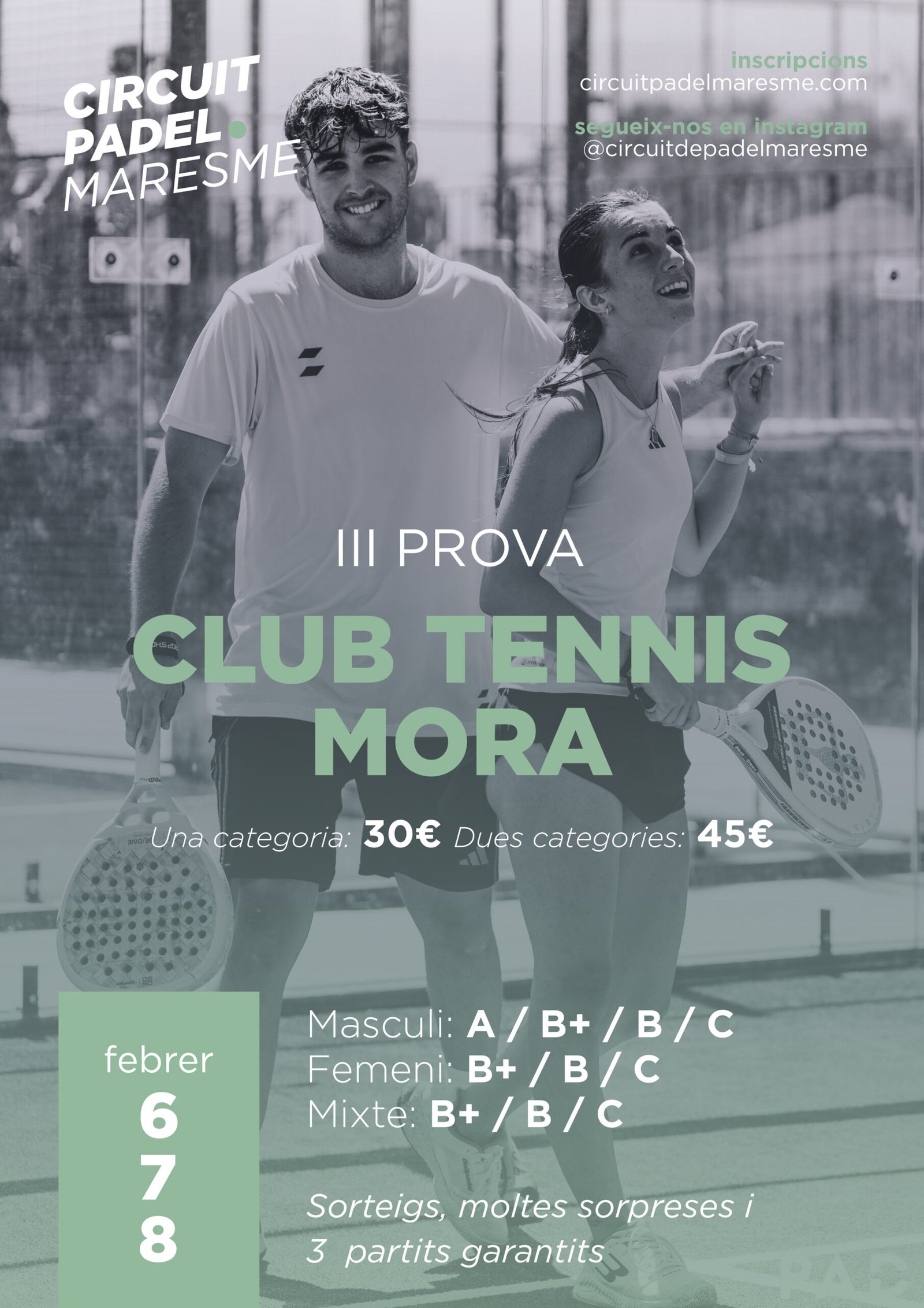 Nos vemos en el Club Tennis Mora para disfrutar de una nueva prueba del Circuit Pàdel Maresme. Tres días llenos de energía, competición y espectáculo, con puntos en juego para seguir subiendo en el ranking.